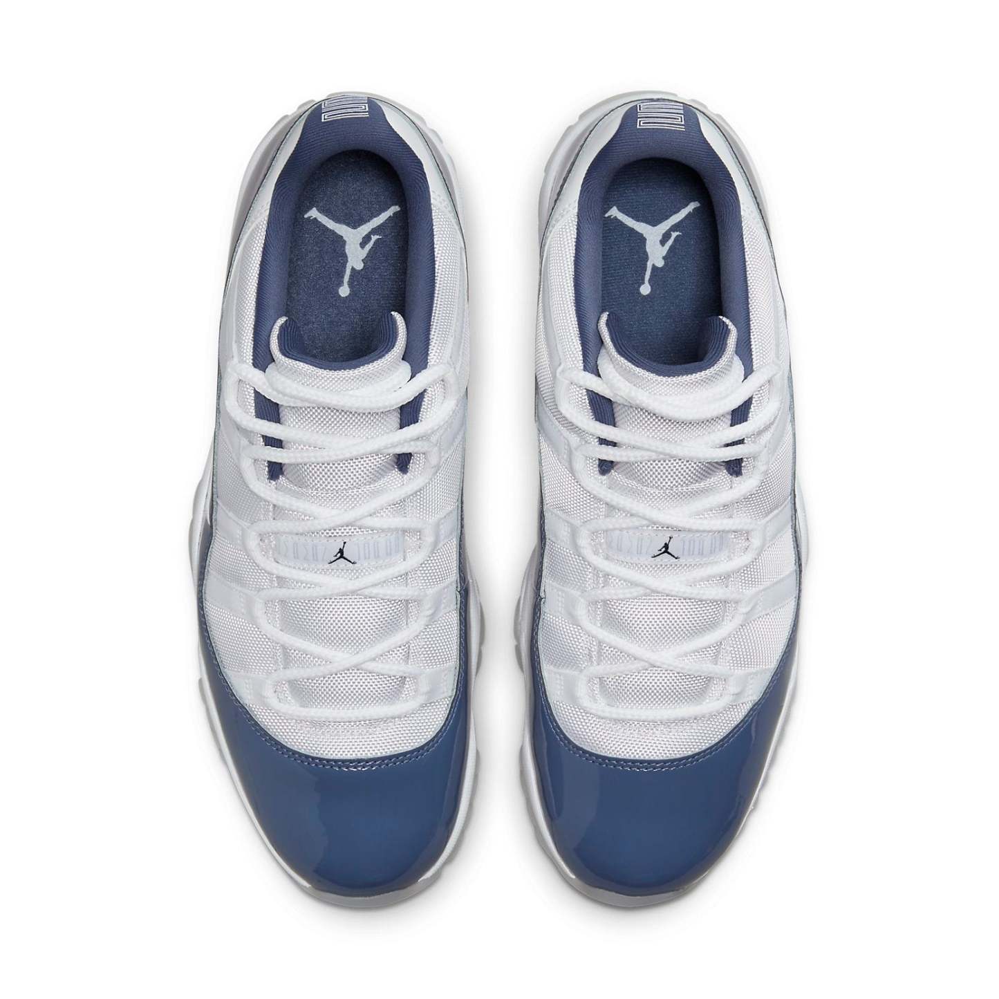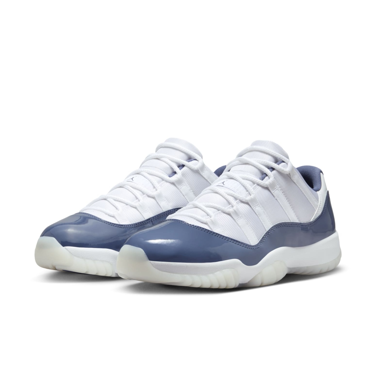 The Air Jordan 11 Retro Low 'Diffused Blue' combines white ballistic mesh with a glossy patent leather overlay in a bright blue hue. Jumpman branding appears on the tongue and heel, while a stylized ‘23’ adorns the back tab. The sneaker sits atop a white Phylon midsole with full-length Air-sole cushioning. Underfoot, the semi-translucent rubber outsole utilizes blue herringbone traction pods and an exposed carbon fiber shank plate.