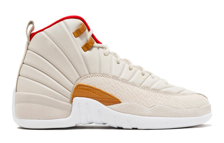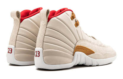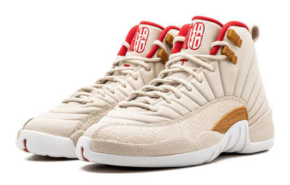 This Air Jordan 12 Retro 2017 CNY celebrates the lunar holiday with a monochromatic tan finish across the upper. It features a light orewood premium textured leather upper, a basket woven textured trim, woodgrain accents, a varsity red trim, and Chinese characters.