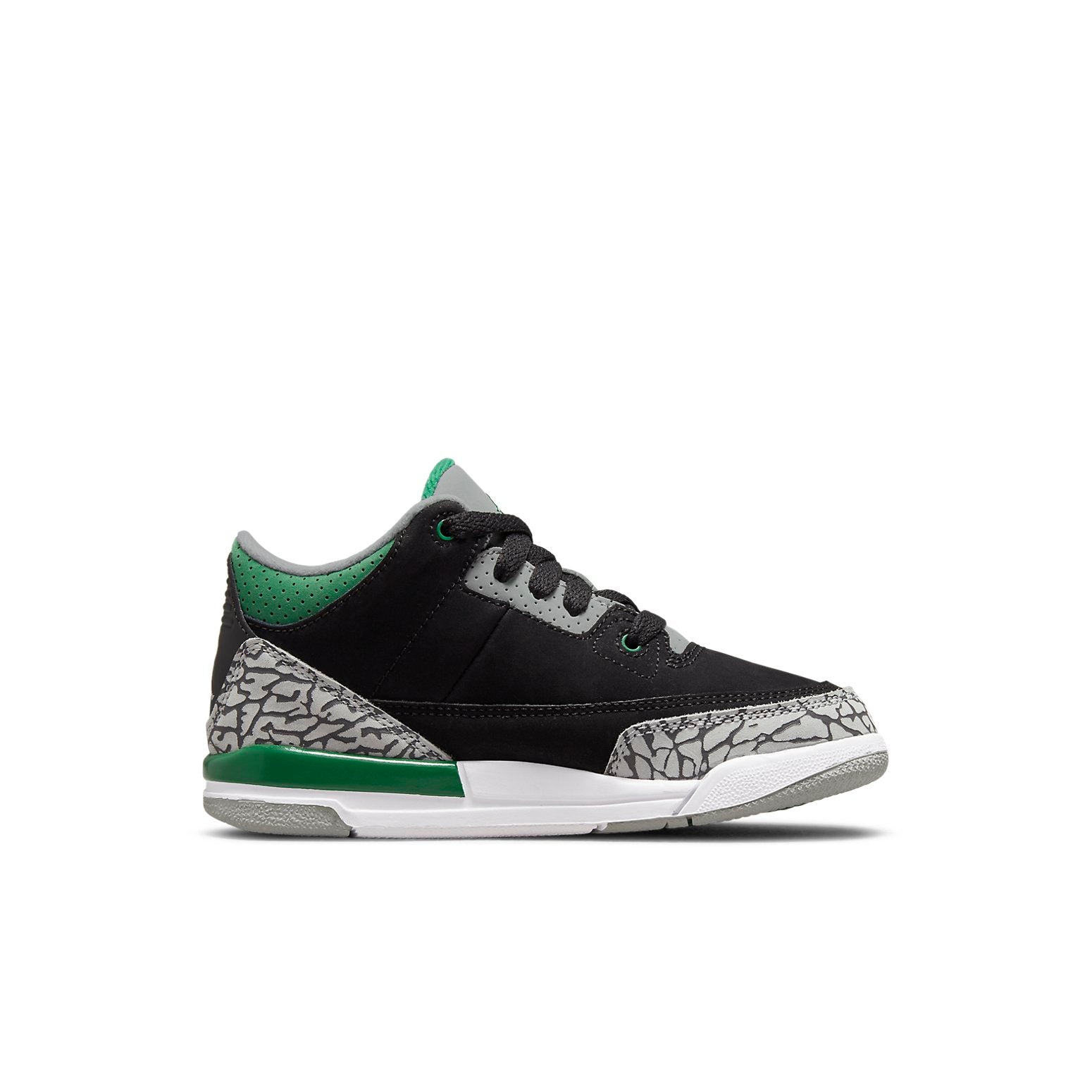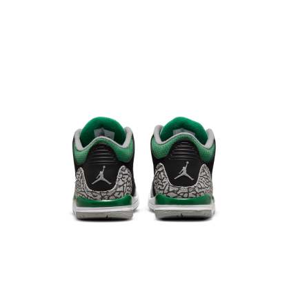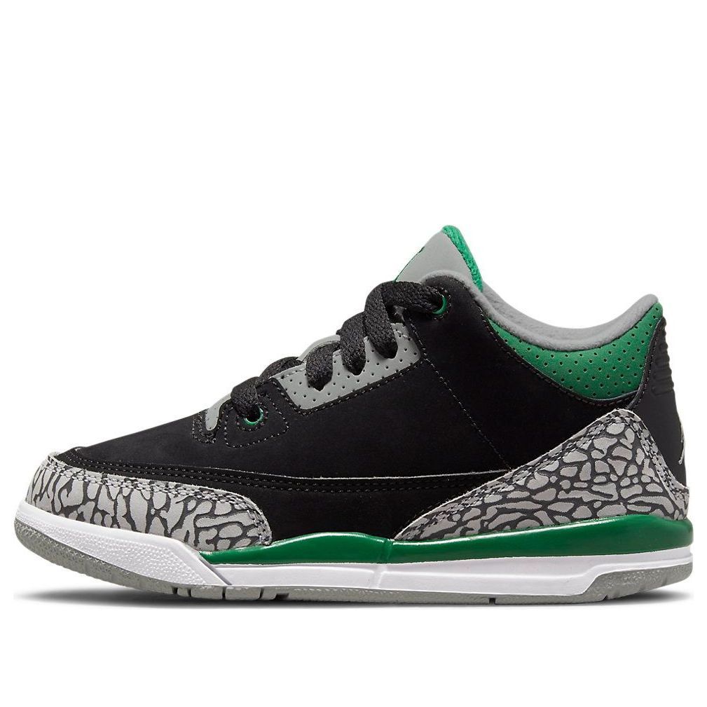 A classic return for the next generation. The Nike Air Jordan 3 Retro PS ‘Pine Green’ adds pops of color to the hardwood legend, originally launched in 1988. Made for little ones, it features smooth black nubuck upper with signature elephant print overlays. Contrasting Pine Green hits appear on the eyelets, perforated collar, and Jumpman icon embroidered on the tongue, while a second Jumpman logo is embossed on the back heel. It rests on a two-tone foam midsole and durable grey rubber outsole. Get them ready to fly high on and off the court.