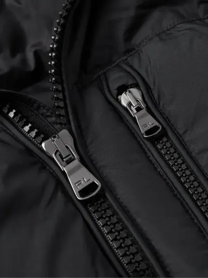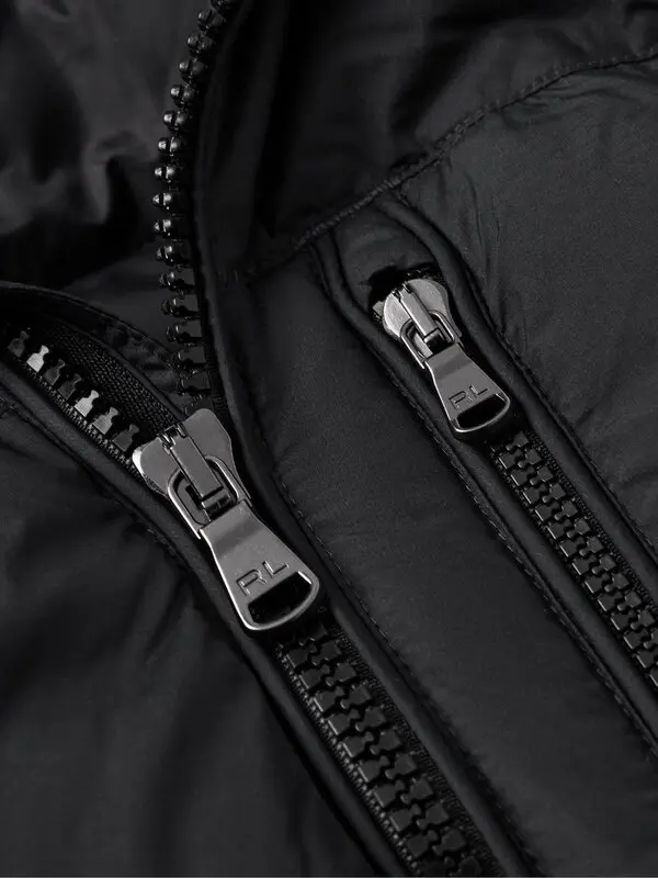 This down jacket provides warmth for layering. Made from quilted recycled shell, it features an embroidered signature pony emblem, a detachable hood, zipped pockets, and VELCRO®-fastening cuffs. The jacket is hooded and has a zip up closure.